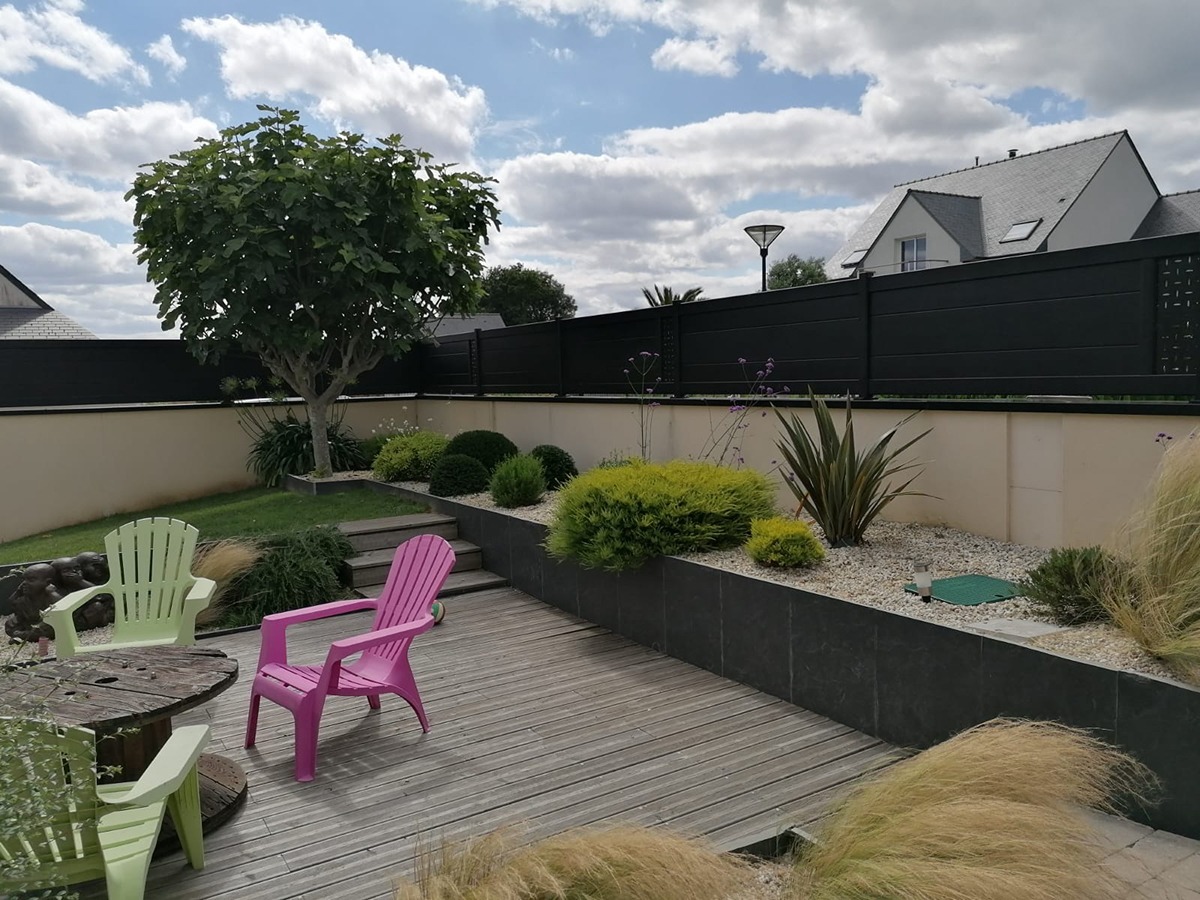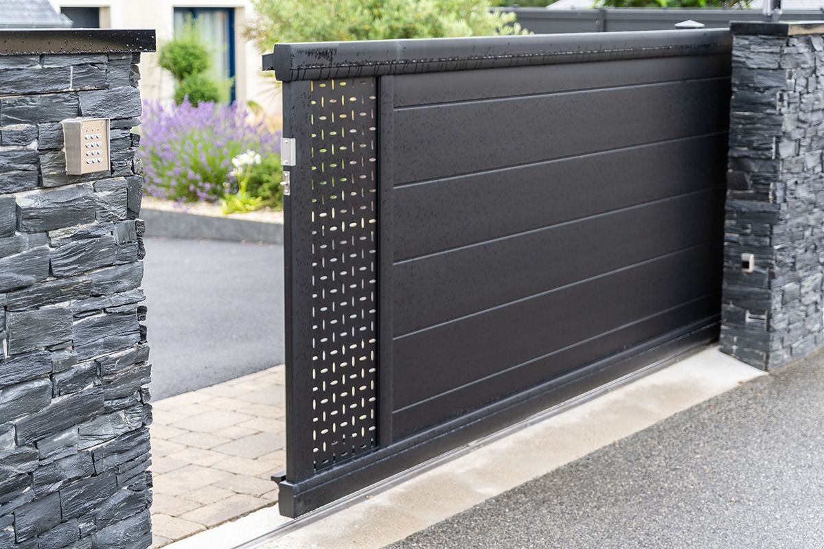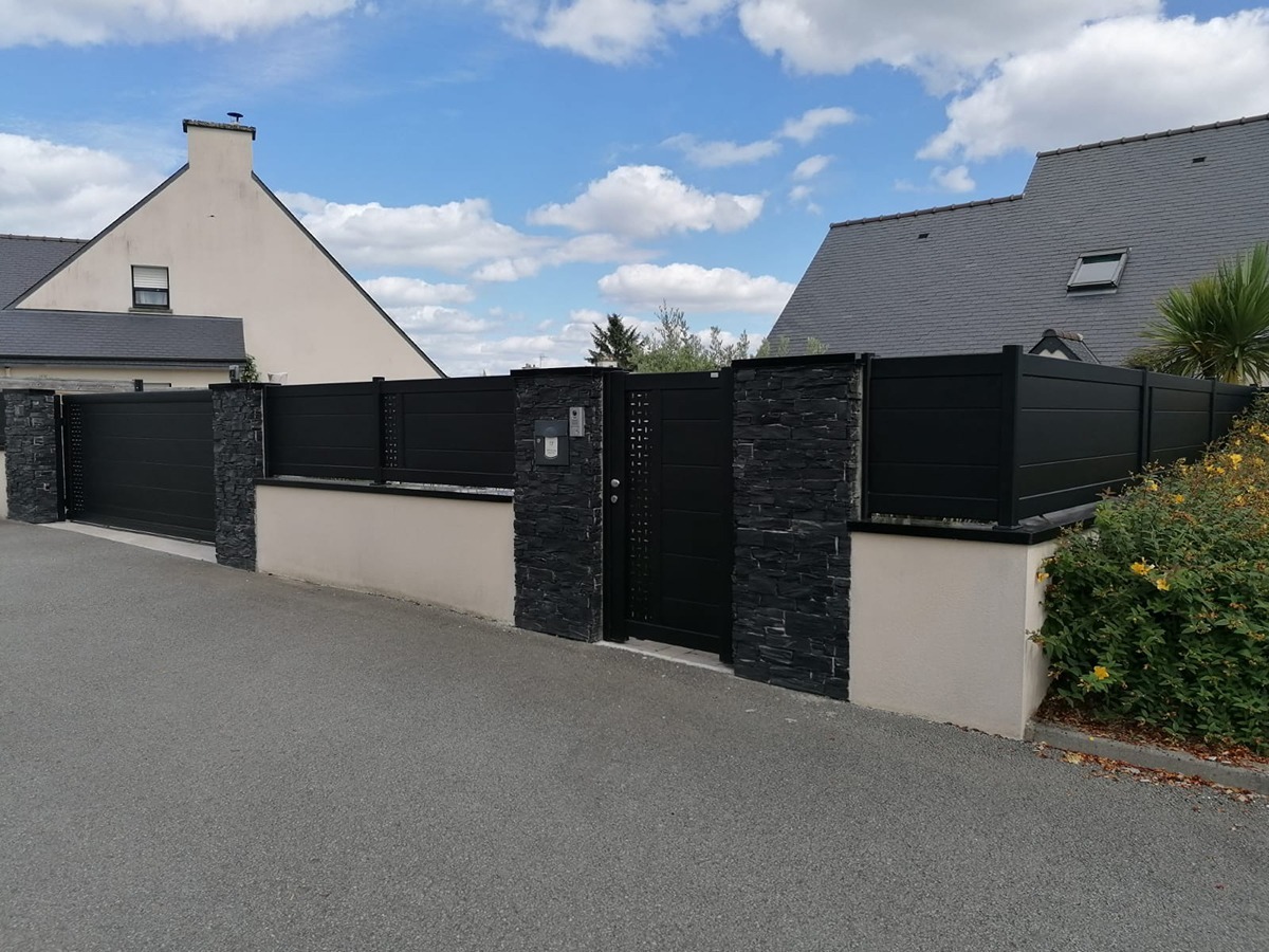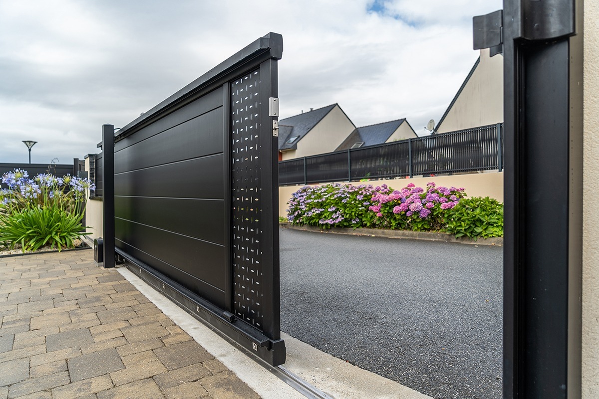 Portail coulissant et portillon Signature et clôtures Origin et Tahoma - Côtes d'Armor (22) Gamme : SignatureModèle : Tahoma C 255 (portail), Aster 255 (portillon), Origin CL 255 et Tahoma CL 255 (clôtures)Coloris : Noir 9005 texturéDécor : Tôle perforée Ellipse