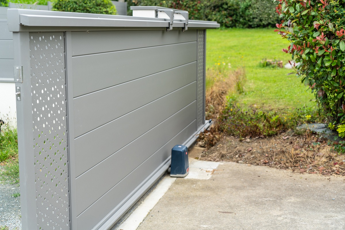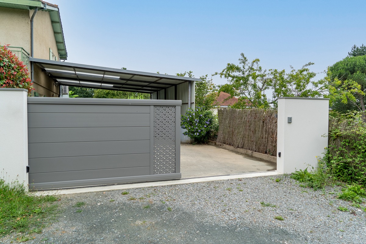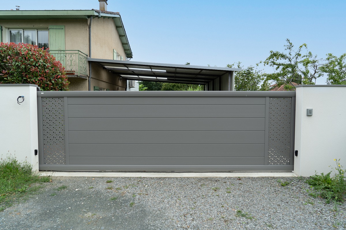 Portail coulissant et portillon Signature - Vendée (85) Gamme : SignatureModèle : Arial C 255 (portail), Arial 255 (portillon), Helvetica CL 255 (clôtures)Coloris : Gris 9007 texturé