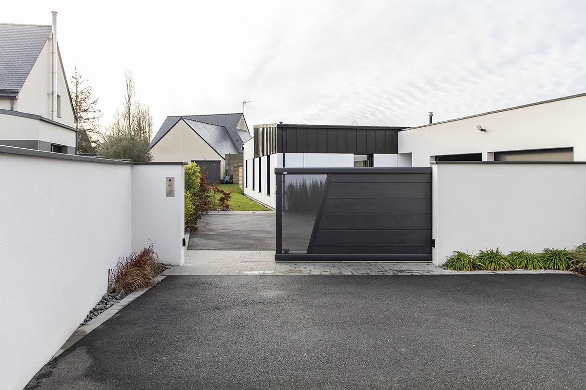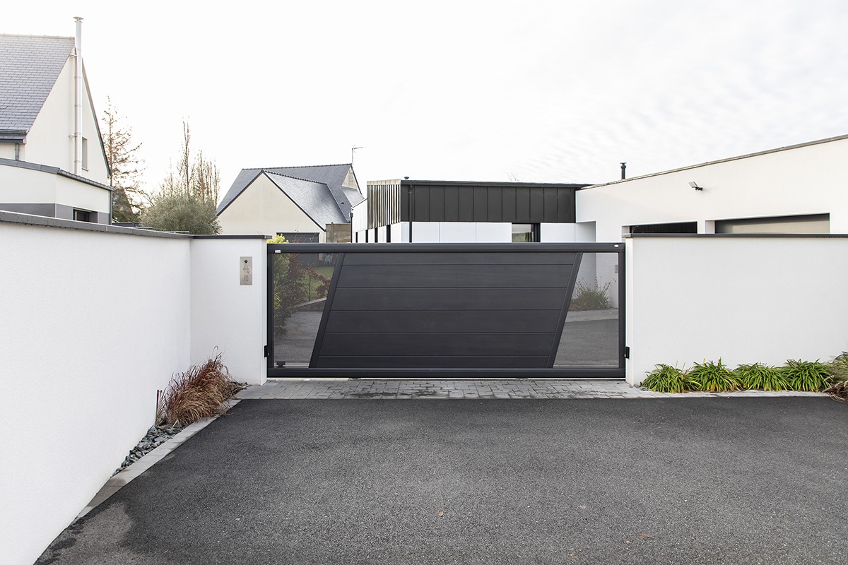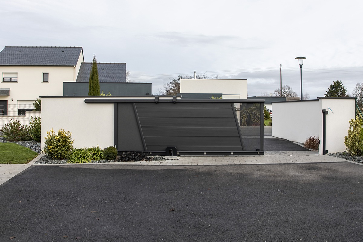 Portail coulissant Signature - Ille-et-Vilaine (35) Gamme : SignatureModèle : Corsiva C255Coloris : Noir 2100 sabléDécor : tôle perforée ronds